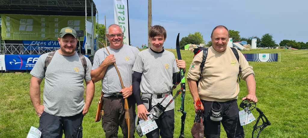 Bonjour à tous, les archers d' Arsac sont de retour du Championnat De France de Tir Nature à Plouec sur Lie en Bretagne ,nous avons passé un magnifique weekend sous le soleil ( promis c'est vrai) . Benoit Taine revient avec une médaille de bronze en sénior 3 arc nu, encore un grand BRAVO a lui, il fallait aller la chercher celle là!. Félicitation aussi à nos jeunes, Ilan Chartrain en U15 et Raphael Michel en U18 qui terminent respectivement 5éme de leurs catégories ils se rapprochent encore du podium, vous serez sur la boite la saison prochaine, c'est sûr et bravo aussi a Alain Bonnet, Dominique Angot et a notre équipe de club qui n'ont pas démérité. Merci aussi aux clubs de tir à l'arc de Blanquefort et de St Laurent avec qui nous avons passé ce weekend en toute amitié. Vivement la saison prochaine!